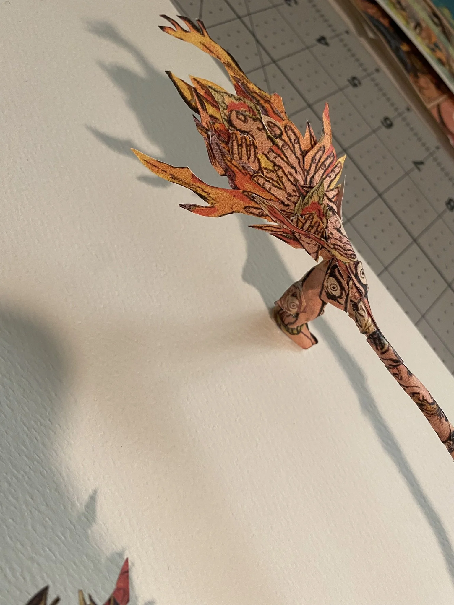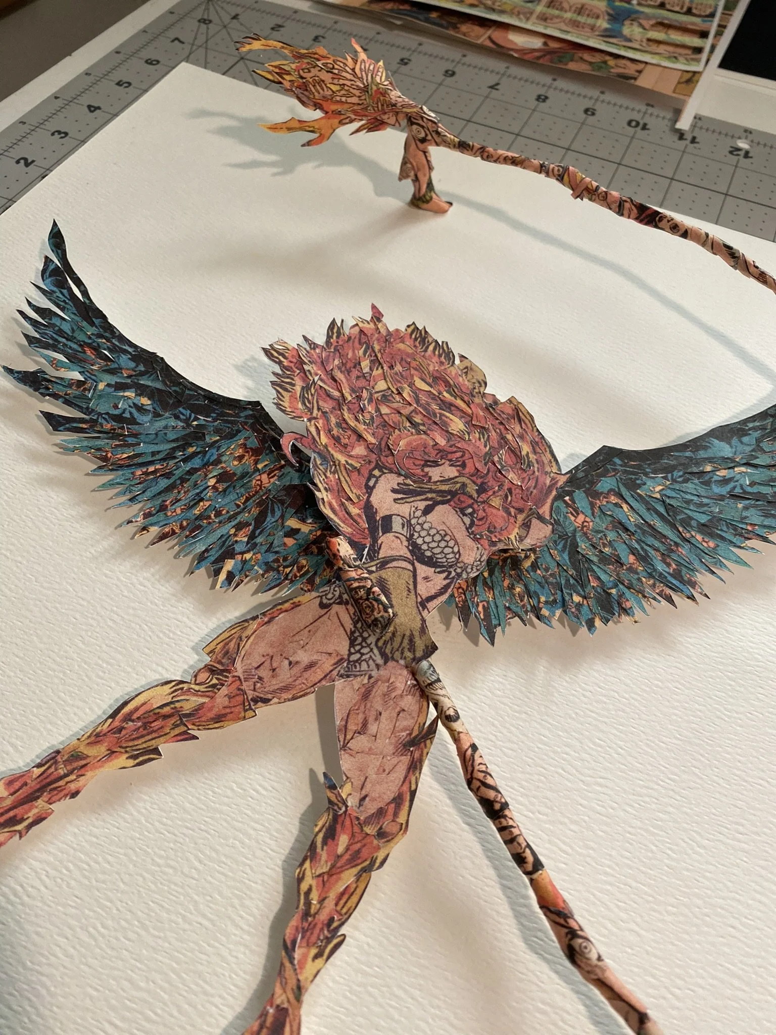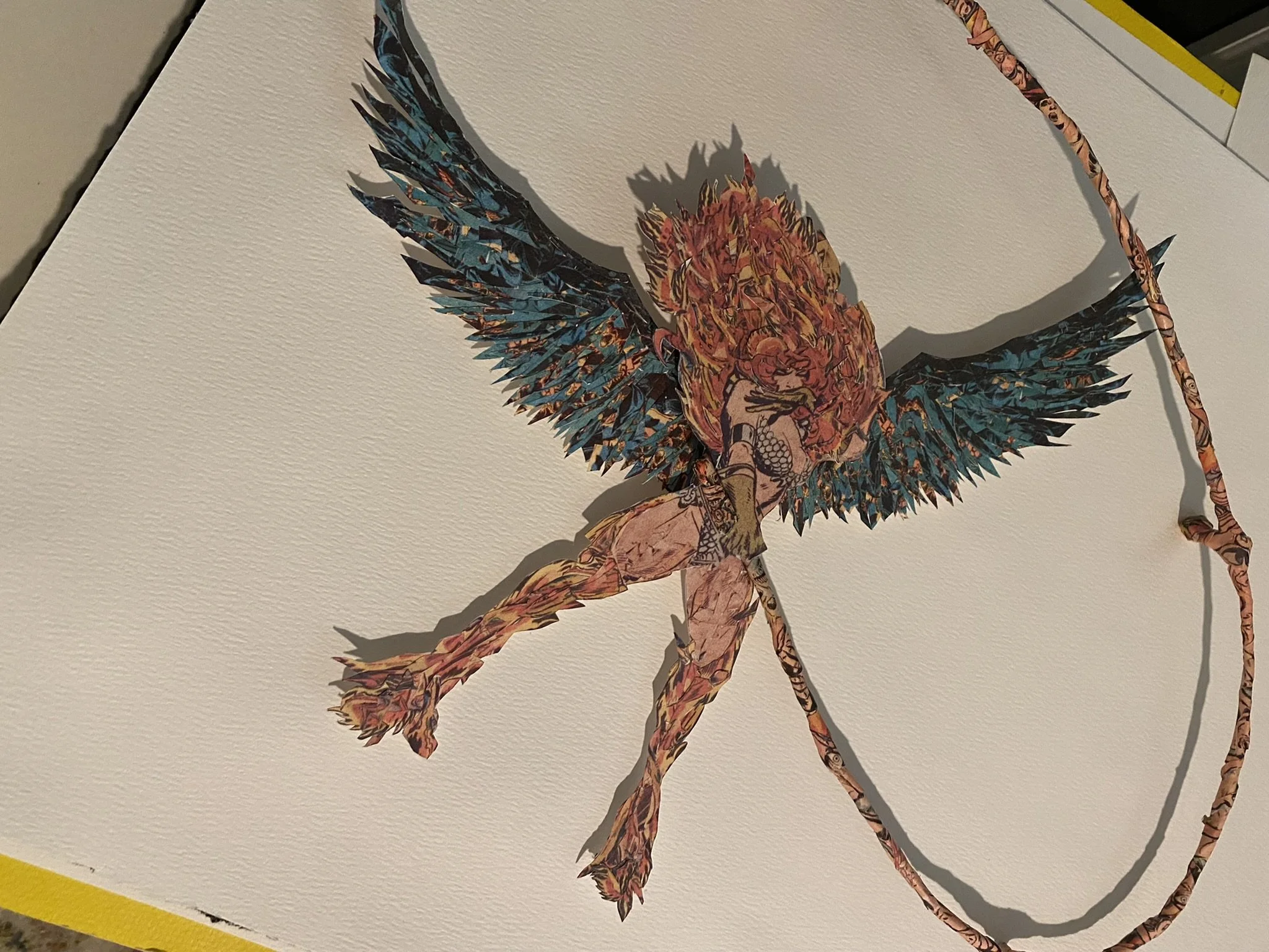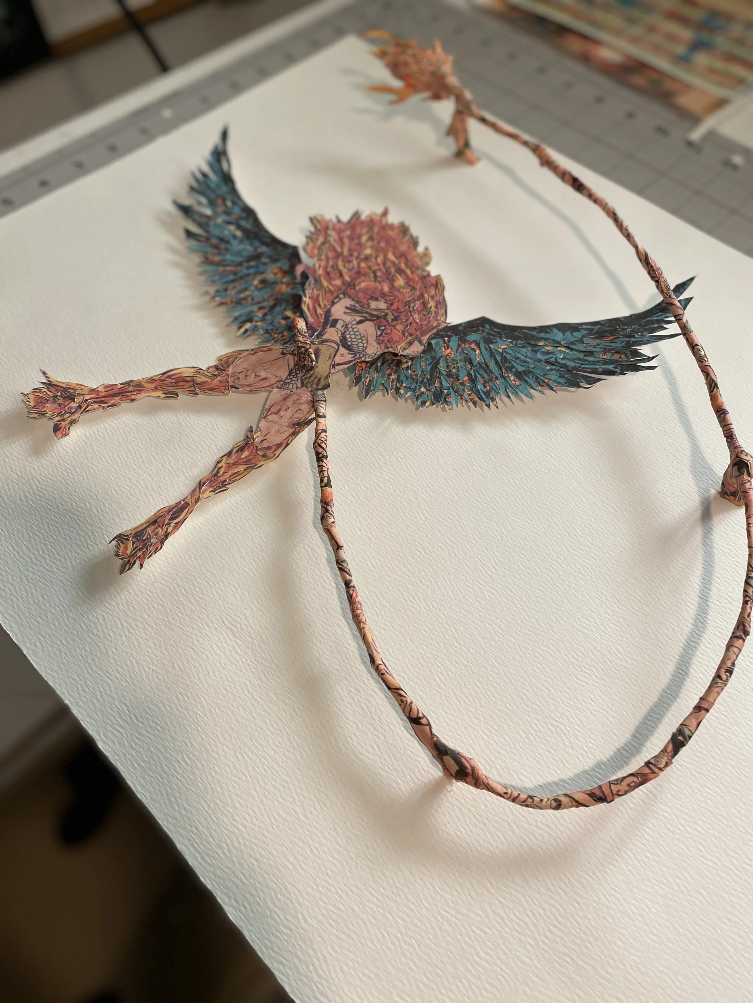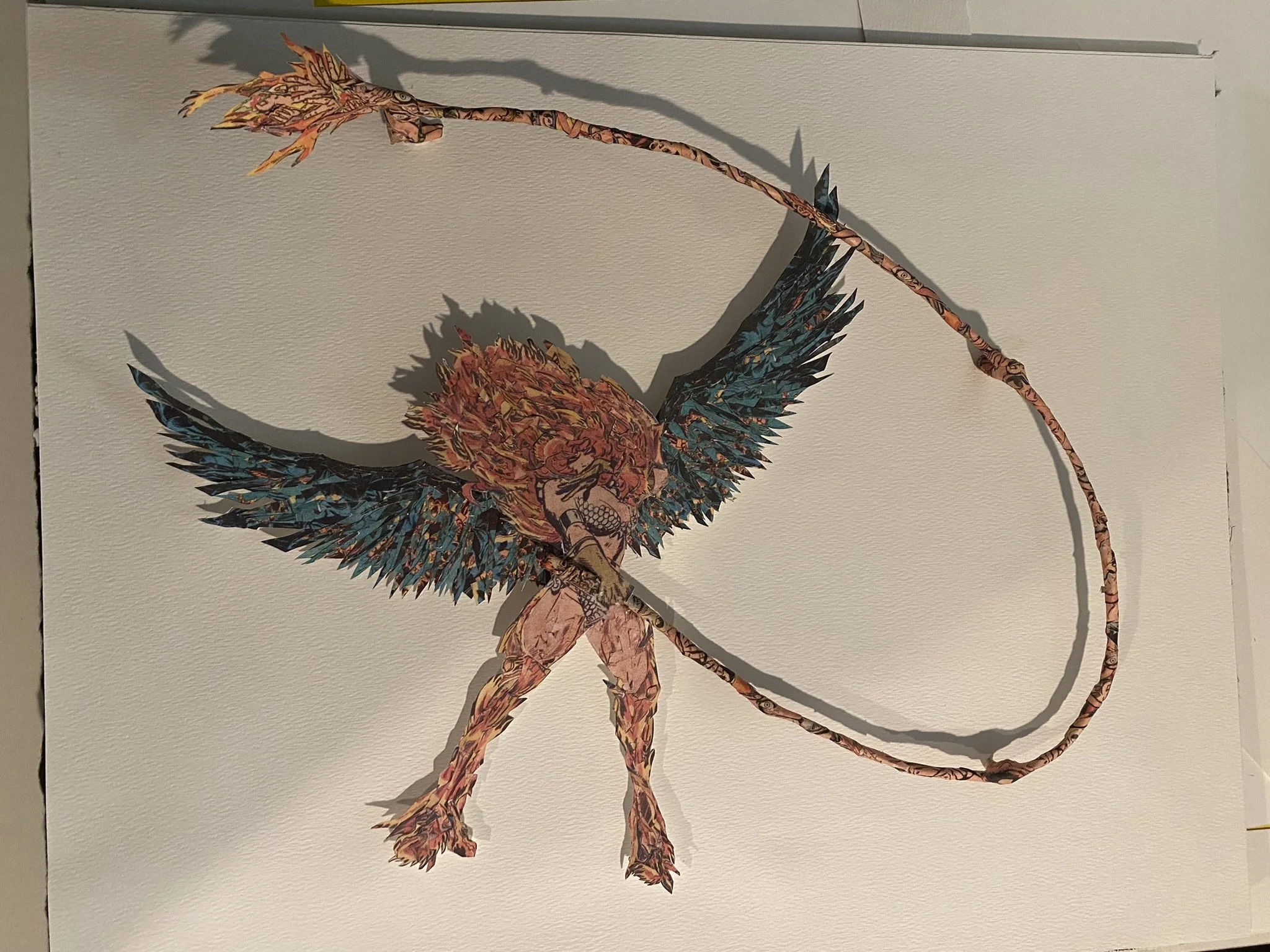 It was one of the first times I really tried to use a multitude of source materials to create a new collage image, i often times will use a lot of source materials that are from a single comic for reasons such as , the aging of the materials, and color and style. I also really wanted to explore the three dimensional space with a traditional two dimensional style but I wanted to avoid just making a paper sculpture. I wanted to create a hybrid of sorts. The end result is a visually exciting images that is somewhat two dimensional and inhabits a three dimensional space as well as interacting with the negative space around the piece using shadows and light as its lifted off the page.